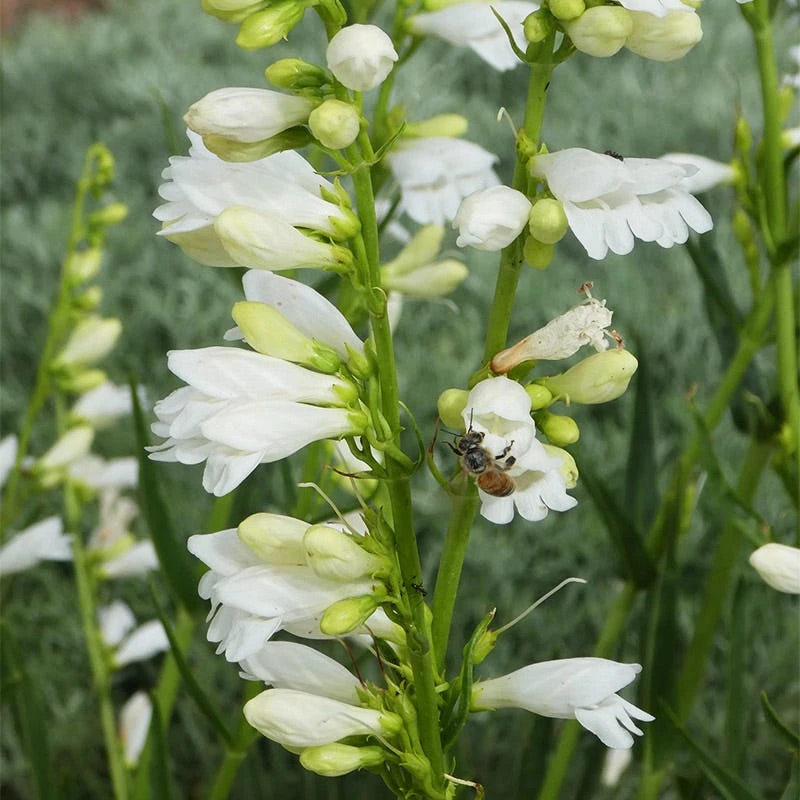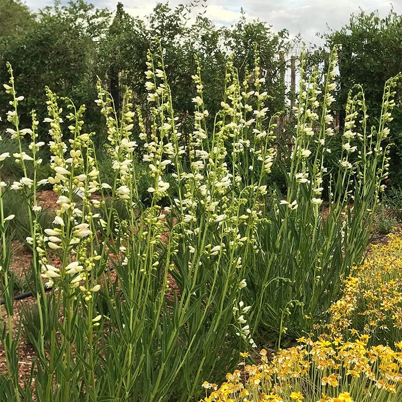 (20-24″ tall x 24-30″ wide) Blanca Peak™ White Penstemon (Penstemon strictus), named after the fourth highest peak in the Colorado Rockies, is a departure from the species’ usual blue and violet flowers. It’s an easy-to-grow beardtongue, and the late spring flowers make an arresting combination when planted with red-flowered Centranthus (Jupiter’s Beard or Valerian), yellow Achillea (Yarrow), and English Lavender. Spreading steadily via stolons to form large clumps, Penstemon strictus is one of the longest-lived, most easily grown of the Penstemons. A real showstopper! Cut off flowering spikes after bloom; leave a few if reseeding is desirable. Be the first to plant this award-winning white-flowered beardtongue, introduced by our Chief Horticulturist David Salman for 2021.